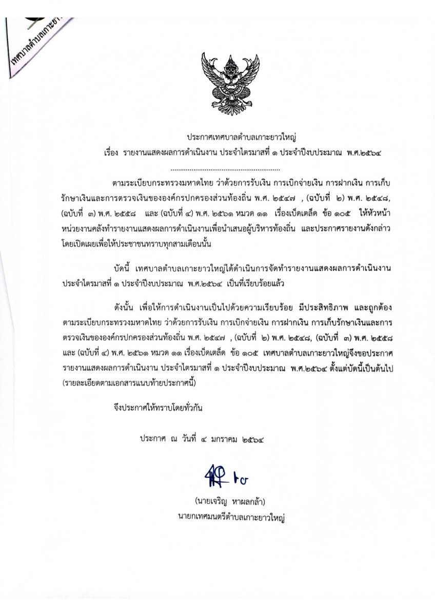 ประกาศ ผลการดำเนินงาน ไตรมาศที่ 1-64
